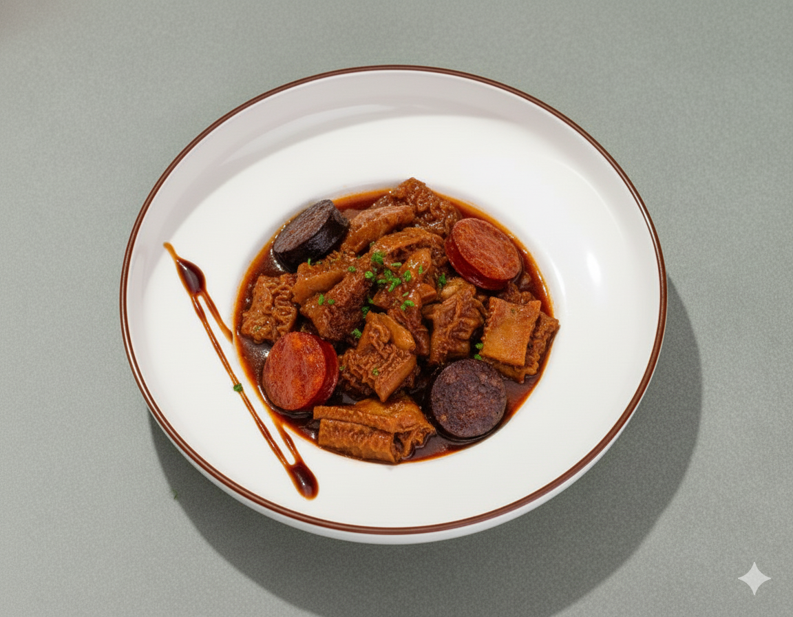 Callos de ternera 28%, pata de ternera deshuesada 12,85%, morro de ternera 12,85 %, cebolla,picadillo de jamón (jamón curado,sal,azúcares, conservadores E-250,