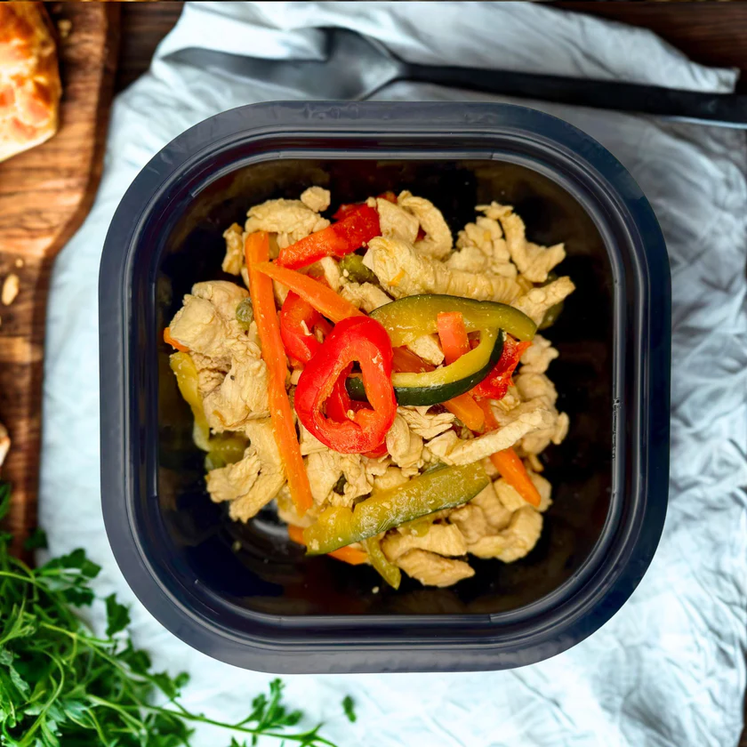 Pavo (46.9%), Pimiento rojo (7.1%), Pimiento verde (7.1%), Calabacín (7.1%), salsa de soja sin gluten (3.5%) (agua, habas de soja, sal, vinagre de alcohol), Salsa de ostras (1.8%) (agua, azúcar, proteína vegetal hidrolizada (agua, proteína vegetal hidrolizada, sal), almidón de maíz modificado, ostras deshidratadas en polvo 0.1%, vinagre de alcohol, pasta de extracto de levadura, corrector de acidez (ácido láctico), aroma natural, colorante caramelo); Zanahoria (7.1%), Aceite de girasol (2.3%), Perejil seco (0.2%).